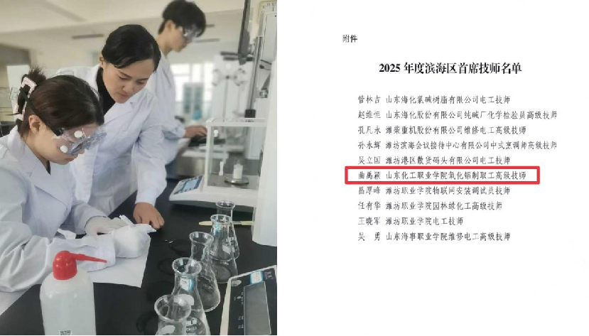 近日,潍坊市滨海经济技术开发区党群工作部公布 2025 年度滨海区首席技师名单,化学工程学院曲禹颖老师凭借扎实的专业能力、突出的教学成果与技术贡献成功入选。
