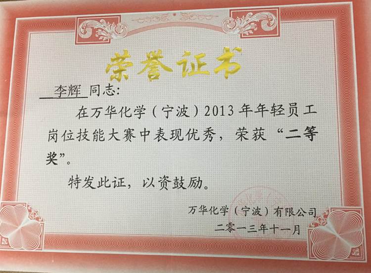 2013年在员工岗位技能大赛中表现优秀,荣获“二等奖”;