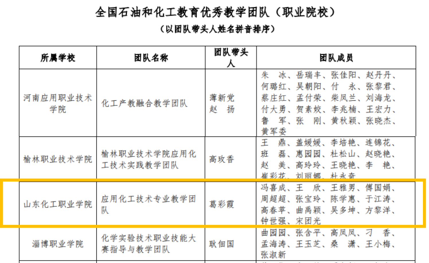9月22日,中国化工教育协会发布了《关于公布2023年全国石油和化工教育教学名师、优秀教学团队、优秀教学管理人员认定结果的公示》,我院由葛彩霞院长牵头发起的应用化工技术专业教学团队被评为全国石油和化工教育优秀教学团队(职业院校)。