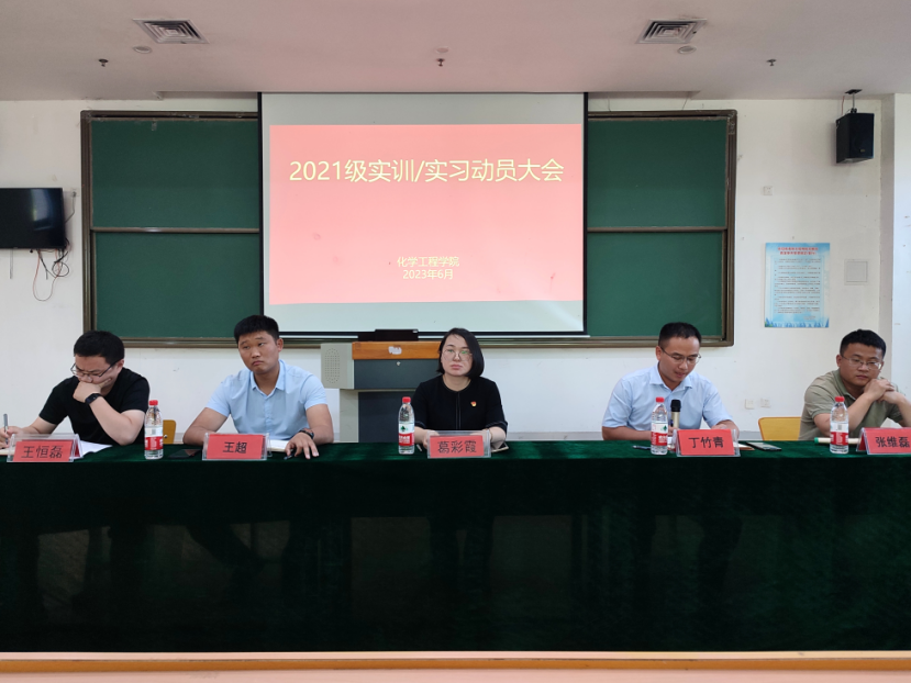 为扎实做好2021级学生实习工作,进一步促进学生对所学知识和技能进行实践运用、总结和深化,引导学生明确认识实习的目的和意义,2023年6月9日下午,化学工程学院通过线上、线下相结合方式,在阶梯1组织召开了2021级实训/实习动员大会。会议由化学工程学院实习管理张维磊老师主持,学校教务科研处副处长丁竹青、培训处副处长王超、化学工程学院党总支副书记、副院长葛彩霞、化学工程学院党总支副书记王恒磊、全体实习指导教师、辅导员及2021级全体学生参加。
