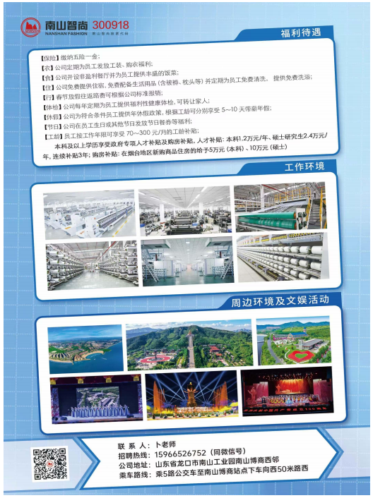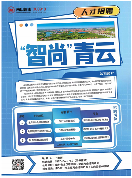 山东南山智尚科技股份有限公司始创于1997年,前身是山东南山纺织服饰有限公司,由中国500强企业南山集团控股,国家级高新技术企业。公司于2020年在深交所上市(南山智尚,股票代码300918),持有“南山”“缔尔玛”两个中国驰名商标。注册资本3.6亿元。