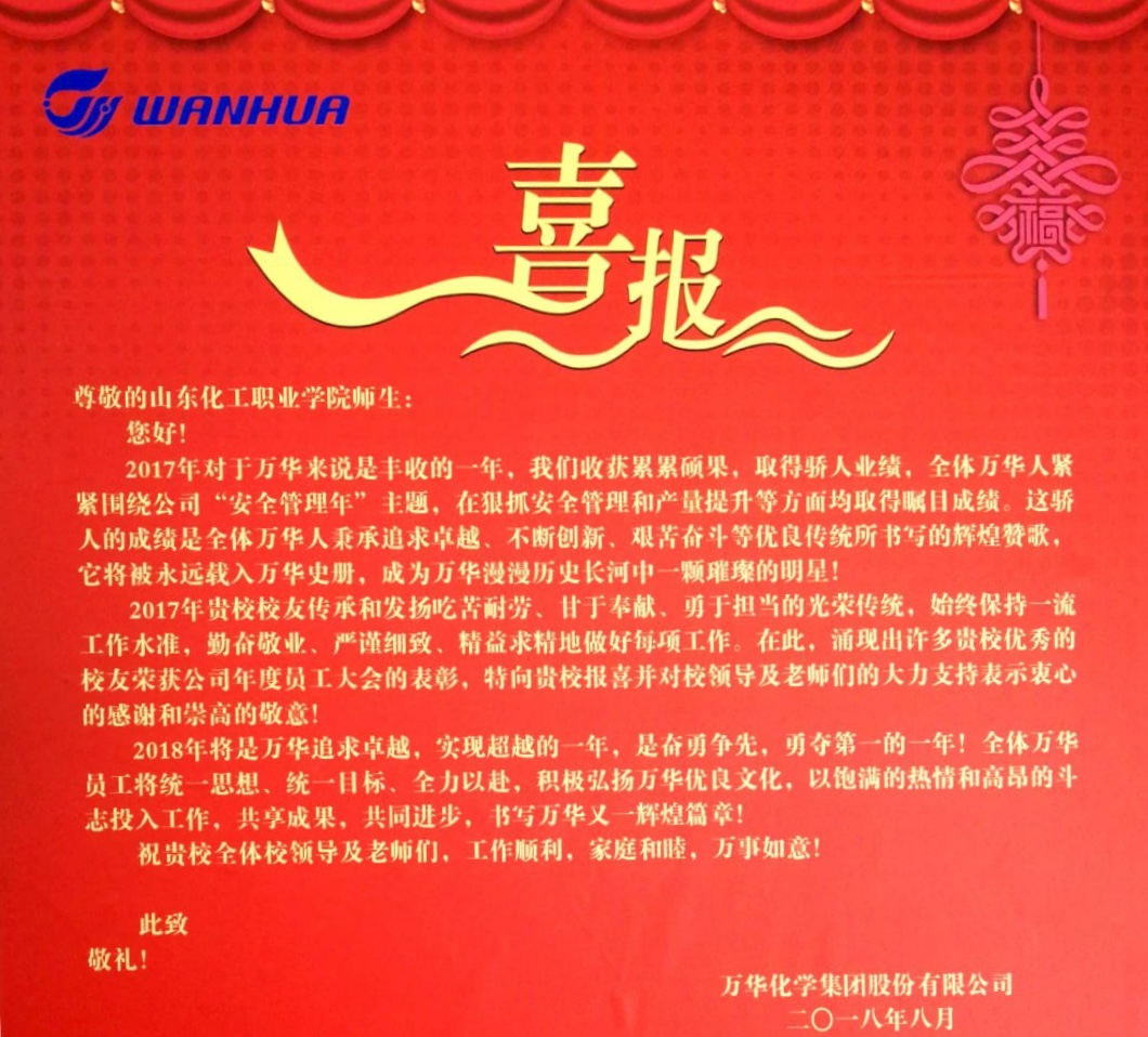我系校友秉承山东化工职业学院艰苦奋斗的优良传统,发挥吃苦耐劳、甘于奉献、勇于担当的工作作风,在万华化学集团有限公司矜矜业业、精益求精,涌现出一大批被表彰的优秀校友。这也是山东化工职业学院长期坚持育人为本、德育为先的结果。在学院领导的大力支持和冯喜成主任的领导下,化学工程系已经打造了一支身正为师、行正为范、专业强的教师团队,致力于为国家培育爱国、敬业、诚信、友善的社会主义新青年;为社会树立勤奋认真、严谨细致、创新创优的新形象;为企业培养专业硬、能力强、素质高的优秀员工。