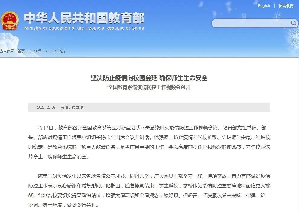 截至今日,全国各地新型肺炎疫情防控工作形势严峻。2月7日,教育部召开全国教育系统应对新型肺炎防控工作视频会议。教育部党组书记、部长、部应对疫情工作小组组长陈宝生在讲话中强调:“战时状态要有非常措施,要把问题想得更严重一些,应对措施更坚决一些,一切都要做细做实,坚决防止疫情在校园蔓延。要切实强化阵地意识,严格管控学校校门,未经学校批准学生一律不准返校,校外无关人员一律不准进校门。