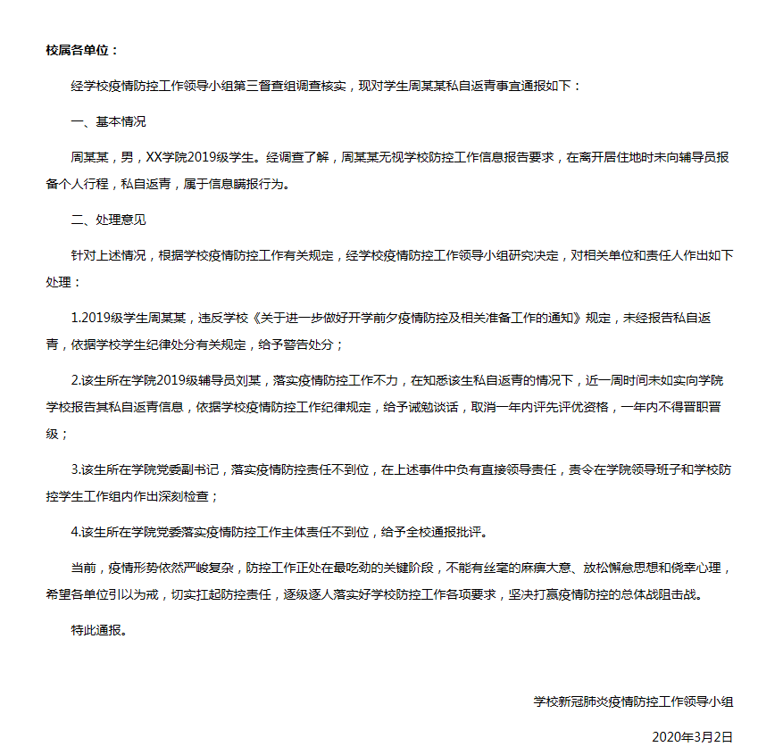 3月2日,中国石油大学(华东)发布一则通告。通告称:2019级学生周某某无视学校防控工作信息报告要求,在离开居住地时未向辅导员报备个人行程,私自返校,属于信息瞒报行为。对此经学校研究给予该生警告处分,其所在2019级辅导员刘某诫勉谈话,取消一年内评优评先资格,一年内不得晋职晋级。