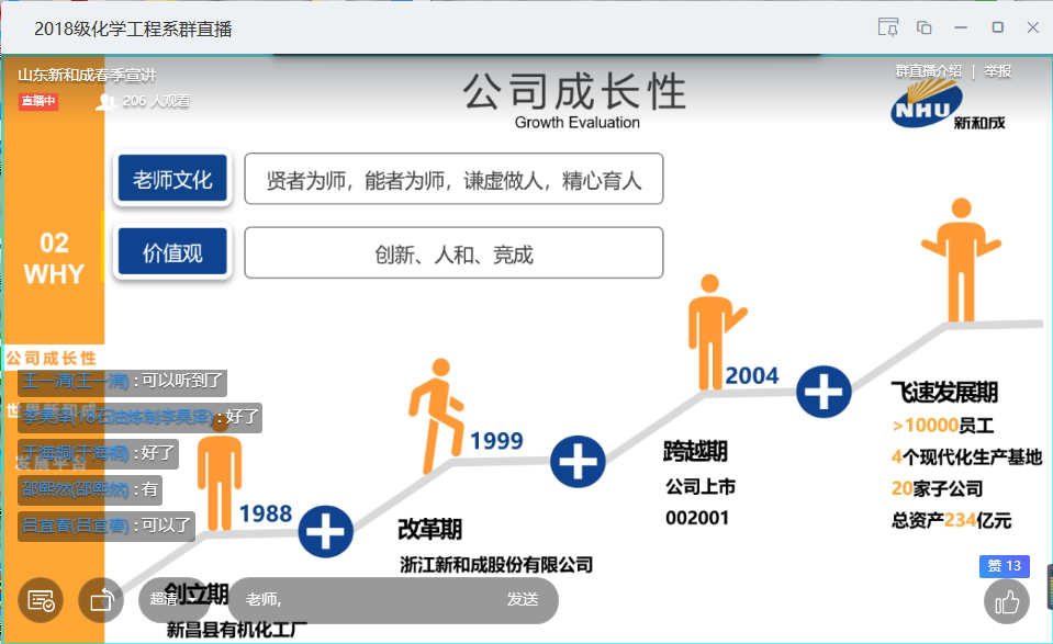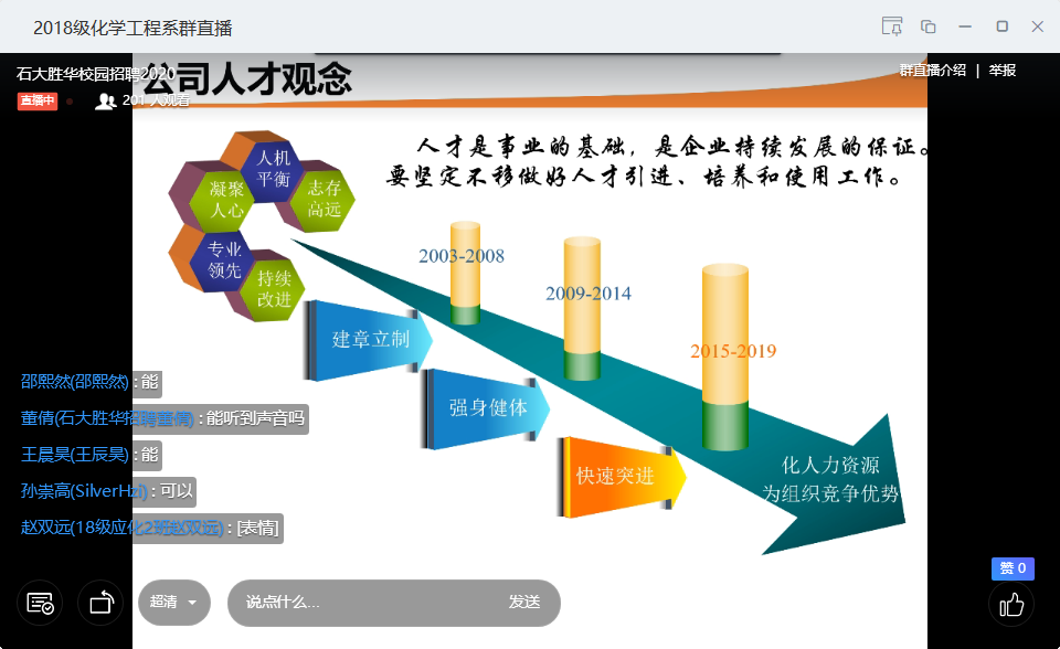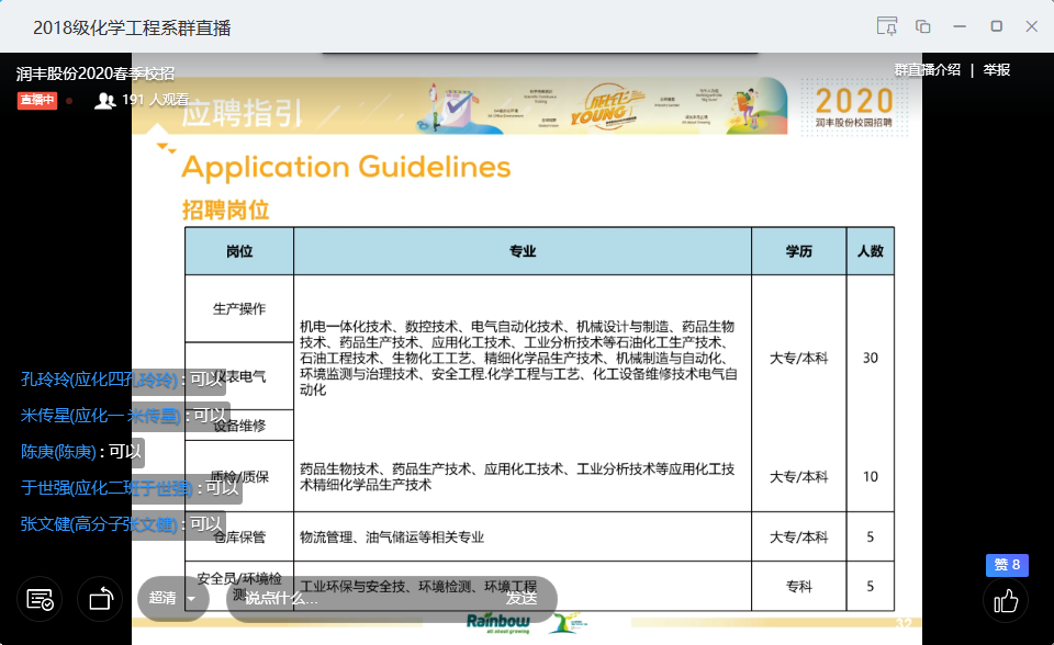 由于疫情防控特殊时期,我院的开学时间还不确定,为了不影响2018级学生的实习,为学生创造更多的实习和就业机会,减轻学生的焦躁情绪,在系领导积极联系和各位辅导员的精心组织下,4月15日下午,化学工程系通过网络平台举办了首期企业网上宣讲暨面试招聘会,2018级全体师生在线参加了本次宣讲会。