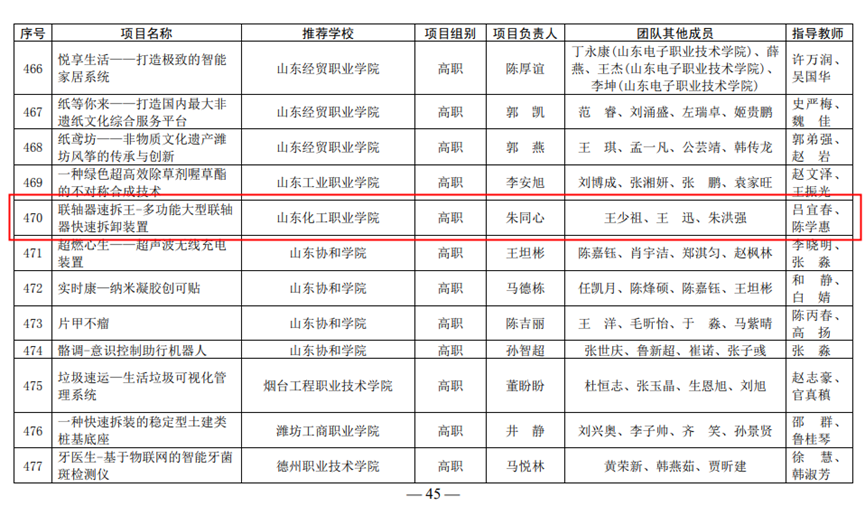 本次大赛分为自主选题和企业命题两个赛道,其中自主选题赛道分为研究生组、本科组和高职组,同场竞技,包括新一代信息技术类、高端制造类、新能源新材料类等六大项目类别。据悉,大赛共有来自全省141所高校的83458个项目报名参赛,参赛学生180116人,指导教师15540人。经过校赛及省赛网评,共评选出一等奖50项,二等奖150项,三等奖300项,这500项奖项中高职院校只获奖160项。参赛人数、比赛规模、竞技水平再创新高,竞争激烈。该“联轴器速拆王-多功能大型联轴器快速拆卸装置”项目之所以能获奖,绝非侥幸。项目负责人朱同心,2019级应用化工技术专业学生,热爱学习,喜欢钻研,目前已获批四项国家实用新型专利证书,该项目就是以其中一个专利--“多功能大型联轴器快速拆卸装置”为基础,研发出产品模型进行参赛,这一装置,适用于拆卸各种各样的大小型联轴器,省时、省力、省物、安全。且朱同心因专利直接认定齐鲁工匠后备人才。