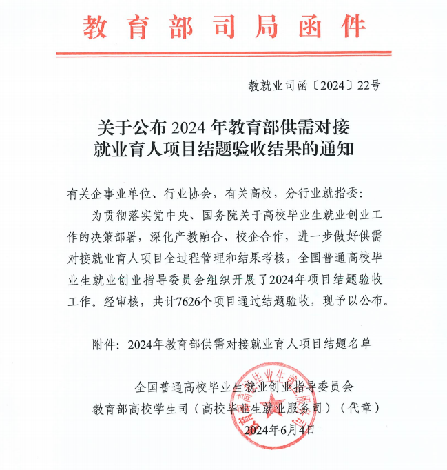近日,教育部供需对接就业育人项目平台发布了《关于公布2024年教育部供需对接就业育人项目结题验收结果的通知》(教就业司函〔2024〕22号),我校化学工程学院2个项目顺利通过结题验收。