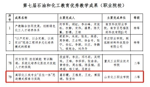 近日,中国化工教育协会发布了第七届中国石油和化工教育教学成果认定结果,我校化学工程学院葛彩霞教师团队申报的《高职化工类专业“五位一体”思政模式探索与实践》荣获优秀教学成果(职业院校)二等奖,王欣教师团队主持的《化工单元操作》教材荣获优秀教材(职业院校)二等奖。