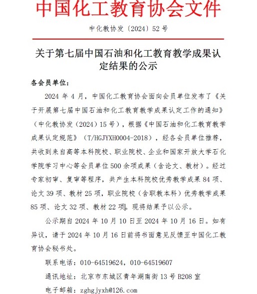 中国石油和化工教育教学优秀成果奖是我国石油和化工教育领域的最高级别奖项,旨在表彰在人才培养模式创新、教学体系建设、课程开发和产教融合等方面取得突出成绩的教育教学成果。该奖项不仅是对国内石油和化工院校在教育教学理论和实践探索中所取得的最新突破的展示,更为行业未来发展提供了借鉴和引领。