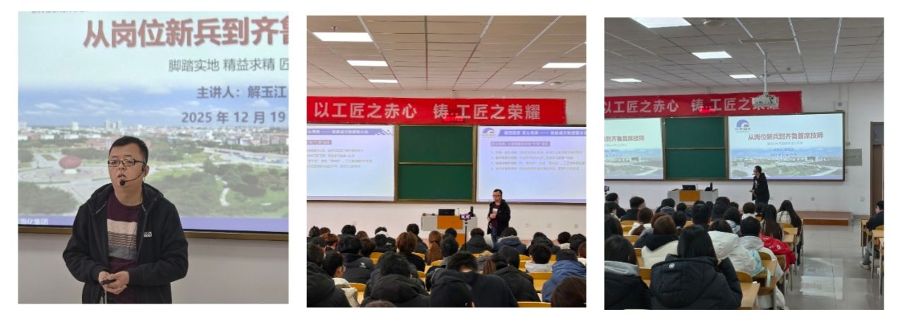 为深入学习贯彻党的二十大精神和二十届四中全会精神,充分发挥劳模工匠的示范引领和榜样带动作用,大力弘扬劳模精神、劳动精神、工匠精神,引导学生树立正确的劳动关和职业观,12月19日上午化学工程学院在阶梯4教室举办“劳模工匠进校园”专题分享会。本次活动特邀齐鲁首席技师、海化集团一线技术骨干解玉江担任主讲,学院领导、教师代表及百余名学生共同参加。