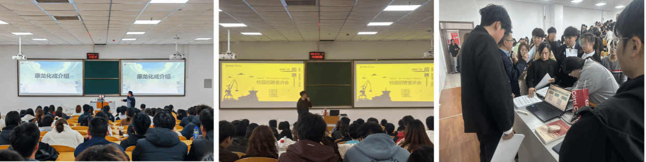 宣讲会上,各企业通过精心制作的宣传片和PPT,全方位展示了各自的硬核实力与发展蓝图。康龙化成(绍兴)药业有限公司携“小分子原料药‘全流程智造’标杆”定位,用宣传片呈现“中美英”全球研发体系、GMP车间单元操作及管培生“轮岗+优化+协作”成长路径;山东新和成药业有限公司以三维动画演示“全自动化生产线+数字化管理”与“年轻化团队+导师带教”环境,彰显“功能化学品全周期服务”实力;恒通物流股份有限公司-山东裕龙港务有限公司用三维动画展现13个泊位港区布局及“海路-陆路-铁路”立体交通网,凸显“高端石化园区港口枢纽”担当;山东小海豚能源科技有限公司通过展示239座油站布局,直观传递“智慧油站生态模式”的创新愿景。针对学生普遍关心的职业成长路径、薪酬福利及人才培养体系,企业负责人逐一答疑解惑,现场互动热烈。宣讲结束后,企业随即开展面试选拔。