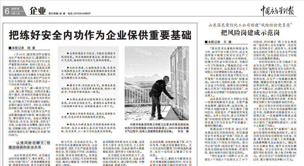 陈修慧总经理认真落实上级有关安全生产工作的要求,坚持把安全生产工作摆在了与业务工作同等重要的位置,把安全作为推进企业发展的重要举措来抓。把“党建引领、文化赋能、情怀助力、知识固本”作为公司安全管理的指导思想;真正做到了主要负责人亲自挂帅指挥,管理者全力组织实施的效果,实现了安全生产“零”事故的目标。结合公司实际设立了“风险防控党员岗”,充分发挥安全示范岗的引领、带动作用,不断增强党员创先争优意识,营造比学赶帮超的浓厚氛围,彰显“一个党员一盏明灯,一个岗位一份安全”的模范作用,并在2024年2月1日,被中国应急管理报进行专项宣传报道。