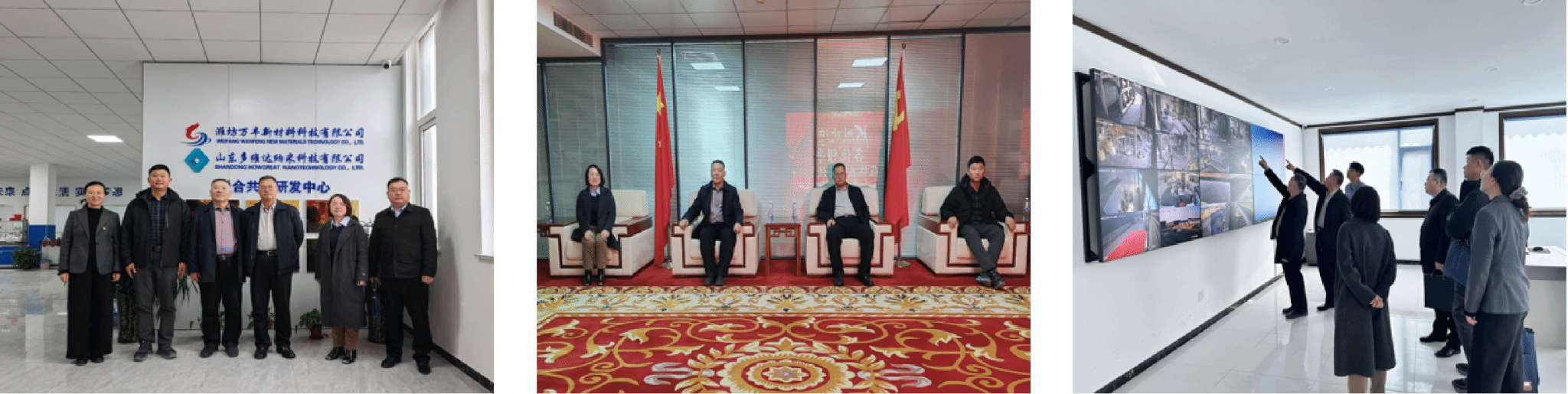 在万丰集团董事长刘士福的陪同下,夏润海一行深入山东多维达纳米科技有限公司生产一线、集团研发基地及总部,深入了解核心产品的工艺流程与技术研发情况。万丰集团始创于2006年,是植根潍坊、辐射全国的国家级高新技术企业,以镁盐新材料为主导产业,专注于环保阻燃剂、高纯氧化镁等产品的研发、生产与销售,构建了完整的产业链。集团旗下拥有潍坊万丰新材料科技有限公司、山东多维达纳米科技有限公司等核心子公司,在潍坊及青海布局生产基地,产品远销海内外。